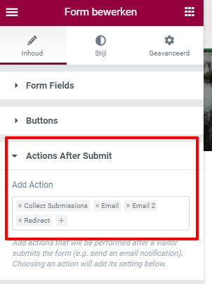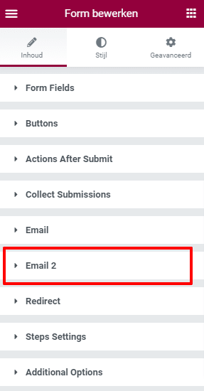 Open de instellingen van jouw Elementor Pro formulier en het tablad: Actions after submit ofwel, acties die we willen activeren nadat iemand het formulier verzonden heeft! Selecteer dan Email 2.