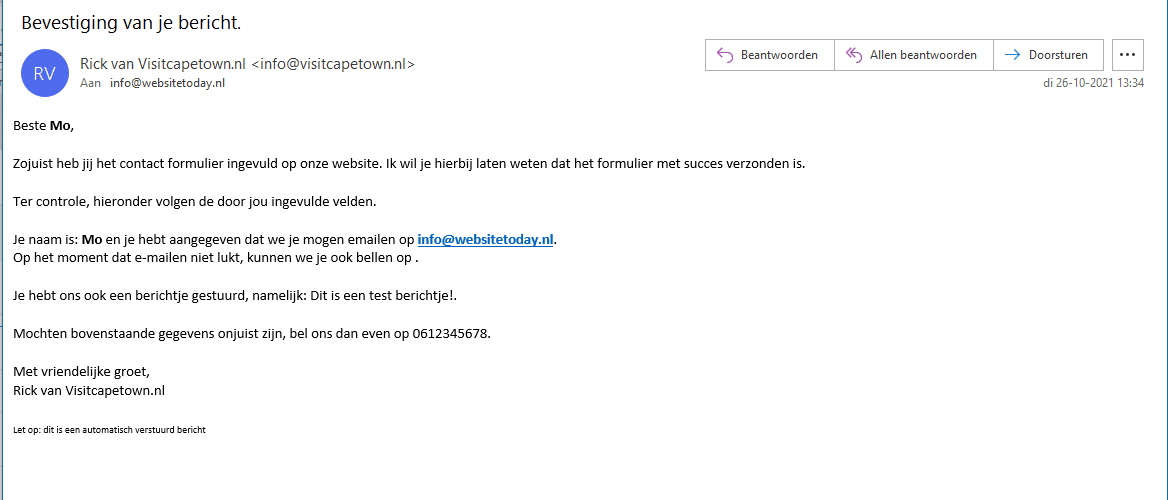 Het resultaat van bovenstaande instellingen en code is dat ik als invuller onderstaand email bericht ontvang, nadat ik het formulier heb ingevuld: