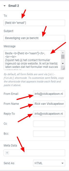 Meta Data: Vind ik zelf het minst interessante, maar je kan ervoor kiezen om bijvoorbeeld de datum, tijd of URL in de mail automatisch mee te sturen.