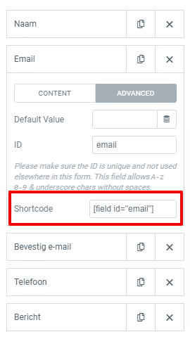 Het is handiger voor jezelf om tijdens het opstellen van jouw contactformulier de juiste field id’s te gebruiken en te onthouden. De field id vormt namelijk de shortcode van het veld die we later in de bevestiging e-mail gaan gebruiken. Zorg ervoor dat de ID’s niet te lang en te ingewikkeld zijn. Hou het vooral kort en simpel.
