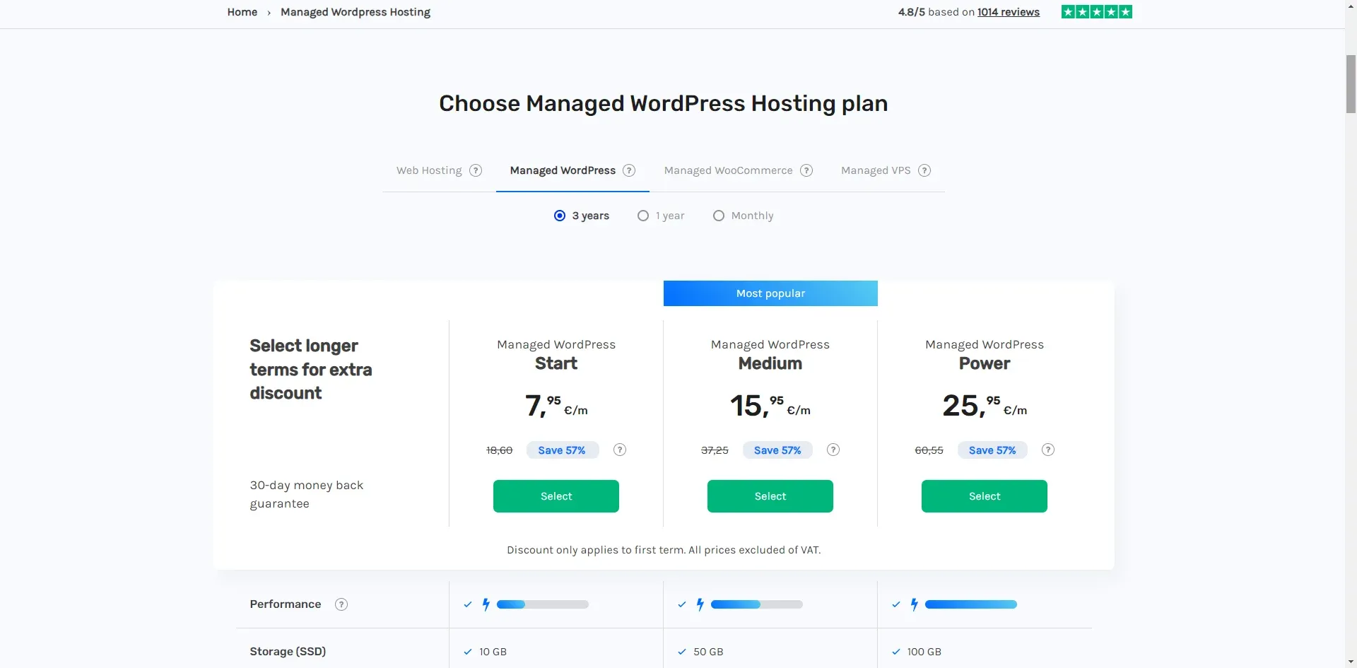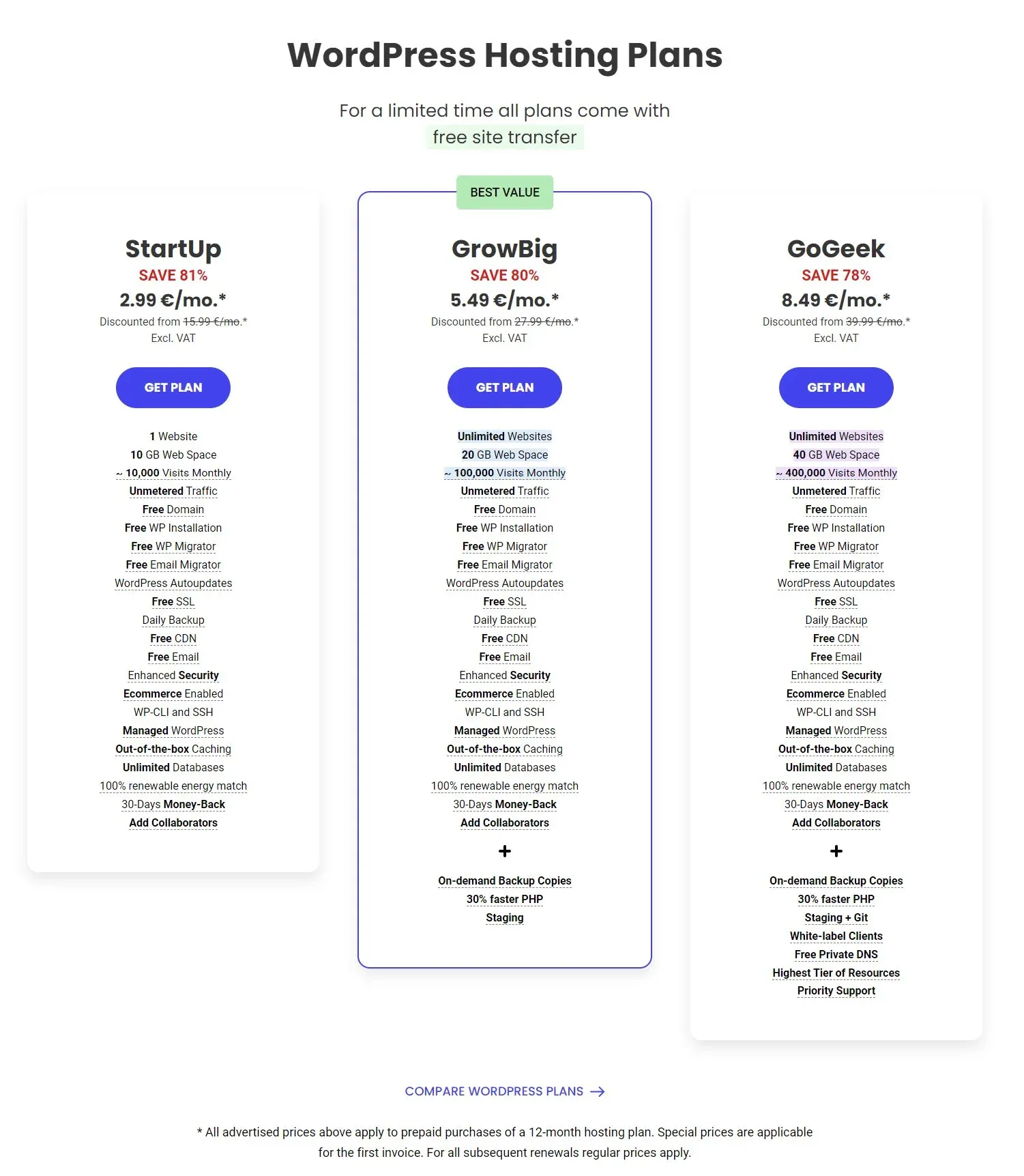Bij Cloud86 noem ik de de prijzen per jaar, net als bij Hoasted en de derde op deze lijst. Het instapprijsniveau is €9,95 per maand, maar als je ervoor kiest om direct een contract van 3 jaar af te sluiten, daalt de prijs voor webhosting bij Cloud86 naar €7,95 per maand. Kies je voor niet geoptimaliseerde WordPress hosting maar ‘gewone hosting’ van Cloud86 kun je al instappen vanaf €1,95 per maand. Aantrekkelijke tarieven toch?