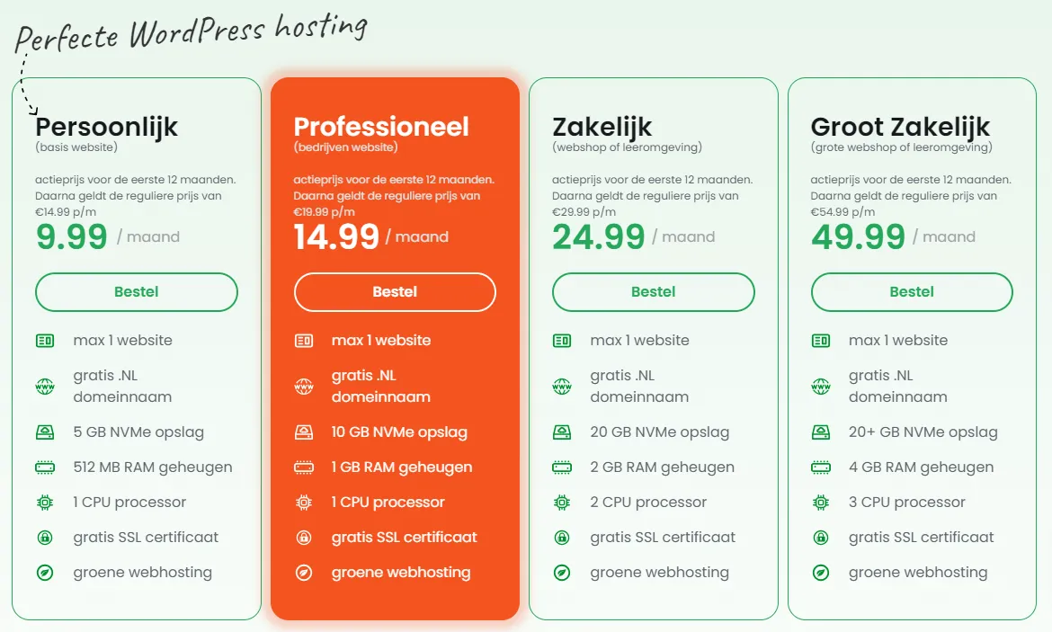 - WordPress Professional: Ideaal voor starters, bloggers en professionals. Hiermee kun je 2 websites hosten, met 1 GB geheugen en 1 CPU-processor. Tot 4 backups per dag. Kosten: € 15,99 per maand.