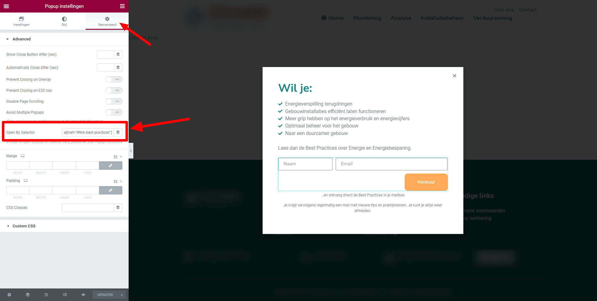 Navigeer in de Elementor bewerker van de betreffende popup naar het geavanceerd item. En nu komt het, plaats in het veld ‘Open by Selector‘ de volgende shortcode: a[href="#link-best-practices"]. Waarbij je zelf een naam kunt geven aan alles achter de #. Link-best-practices kan bijvoorbeeld worden contactformulier, optin o.i.d. (a[href=”#contactformulier”]).