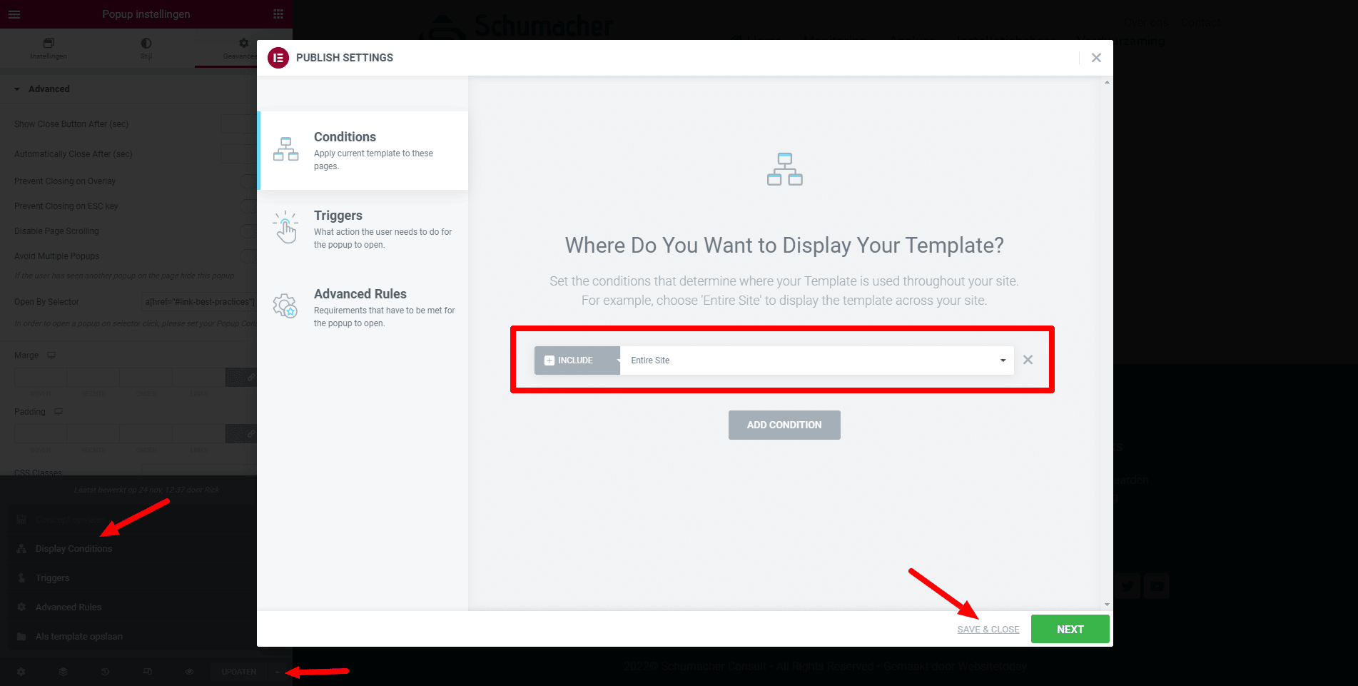 Nadat je bovenstaande hebt ingevuld in het geavanceerde tabblad, navigeer je naar de display conditions opties van de popup. En zet deze conditions op include: entire site. Sla de popup op en je bent klaar voor stap 4.