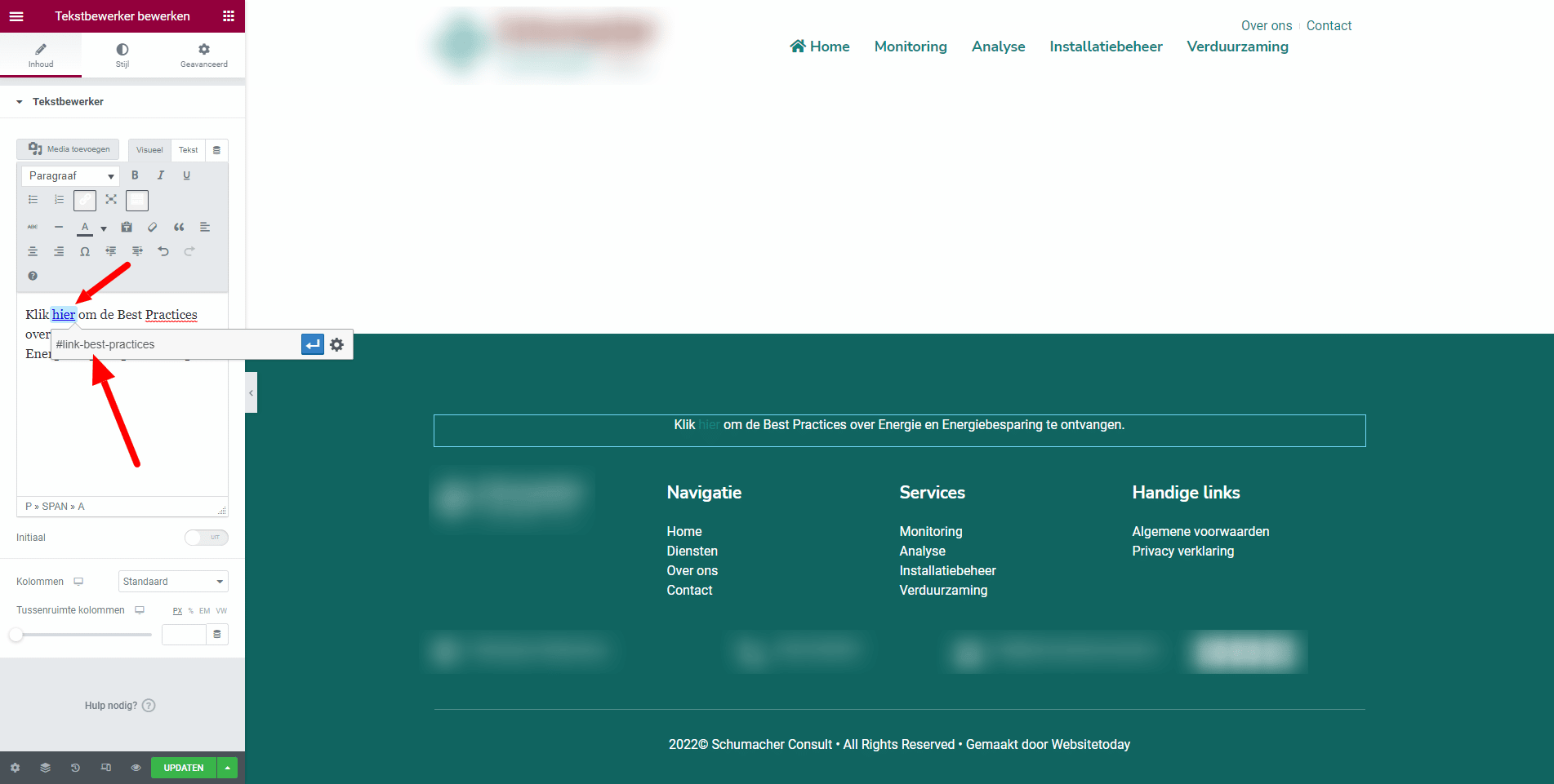 Open de pagina in Elementor of de pagina in de WordPress editor. Selecteer de tekst waar jij de link in wilt plaatsen. Plaats vervolgens het volgende: #link-best-practices (of wat jij ook maar achter de # hebt geplaatst in stap 2). Sla de pagina op en Voila, je bent klaar!