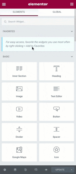 Elementor widgets toevoegen aan favorieten