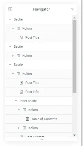 Met de navigator in beeld kan zie je in één oogopslag welke secties en kolommen je gebruikt. Je kan deze ‘ontvouwen’ en de gewenste widget of kolom selecteren. Zo kan je eenvoudig en snel op de juiste plek komen. Mocht je alles in één keer willen ontvouwen, klik dan op het ‘pijltje naar beneden’ link bovenin de editor.