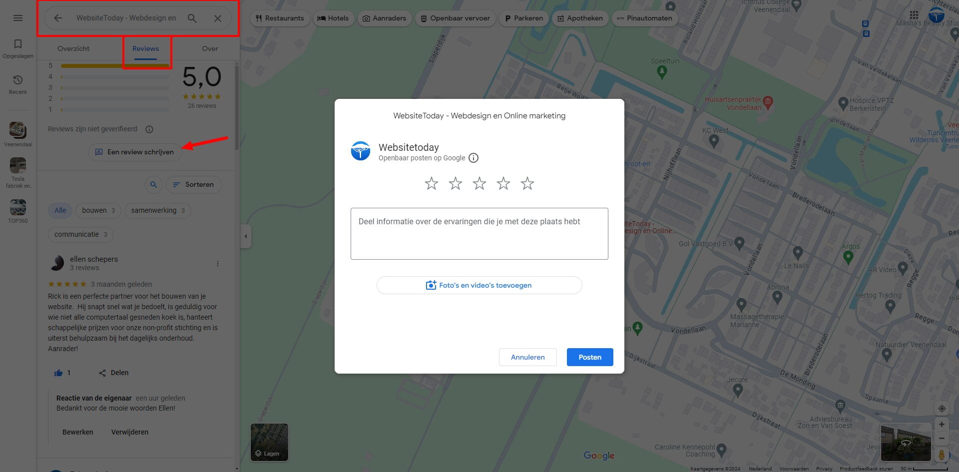Ook kun je via Google Maps je eigen bedrijf opzoeken. Navigeer vervolgens naar het tabblad Reviews en klik op Een review schrijven. De URL die vervolgens ontstaat in je webbrowser kun je kopiëren en delen. De URL zal altijd het volgende beeld openen: