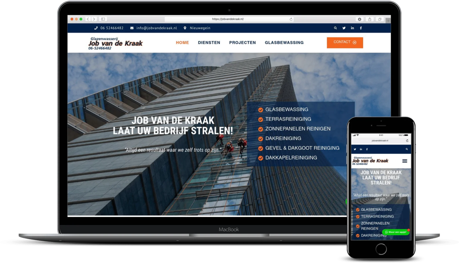 Job van de Kraak werd getipt door een goede vriend van hem. “Job, je hebt nog altijd geen website, ga eens met Rick in gesprek!” Zo gezegd zo gedaan! Job was duidelijk in wat hij wilde, een mooie, strakke en moderne website die zijn glazenwasserij online laat stralen. De website is vrij standaard opgezet met een homepagina, een dienstenpagina en een contactpagina.