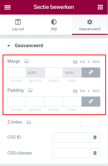 Kolombreedtes: als je de lay-out van een Elementor-kolom bewerkt, zal je zien dat er slechts één eenheid voor breedteafmetingen beschikbaar is: %. Kolombreedtes werken alleen goed en responsive bij het gebruik van percentages, dus er wordt door Elementor geen andere optie gegeven.